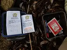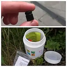 Container sizes range from "nanos", particularly magnetic nanos, which can be smaller than the tip of a finger and have only enough room to store the log sheet, to 20-liter (5 gallon) buckets or even larger containers, such as entire trucks.[30] The most common cache containers in rural areas are lunch-box-sized plastic storage containers or surplus military ammunition cans. Ammo cans are considered the gold standard of containers because they are very sturdy, waterproof, animal- and fire-resistant, and relatively cheap, and have plenty of room for trade items. Smaller containers are more common in urban areas because they can be more easily hidden.