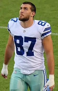 Geoff Swaim (born September 16, 1993) is an American football tight end who is a free agent. He played college football at Texas and was drafted in the seventh round of the 2015 NFL Draft by the Dallas Cowboys. Swaim has also played for the Jacksonville Jaguars.
