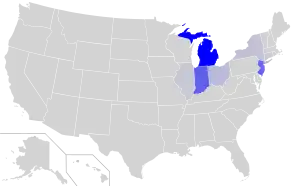 Macedonian is present as the first or second language in migrant communities and second-generation children in the United States and Canada.[6][5] According to data by the Ministry of Foreign Affairs of North Macedonia in 2008, the number of the Macedonian diaspora in the US and Canada numbered 350,000 people, 150,000 of which lived in the latter country.[49] In the US, the largest concentrations of Macedonian speakers is in the states of Michigan (mostly in Detroit), northern New Jersey and southern New York, and Ohio. The number of speakers of Macedonian in the US and Canada includes:
