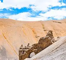The mountain ranges in this region were formed over a period of 45 million years by the folding of the Indian Plate into the stationary landmass of Asia. Himalayas were formed from the base material of the Indian plate.[1][2]