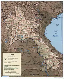 Most of the western border of Laos is demarcated by the Mekong river, which is an important artery for transportation.[1] The Dong Falls at the southern end of the country prevent access to the sea, but cargo boats travel along the entire length of the Mekong in Laos during most of the year.[1] Smaller power boats and pirogues provide an important means of transportation on many of the tributaries of the Mekong.[1]