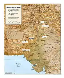 In 1992, The GSP announced the discovery of the huge deposits of coal at Thar Desert in Sindh.[10] The GSP sponsored and published various studies on the geology of Thar Desert.[11] In the 1990s, the GSP issued and produced several maps of atlas of Pakistan, with mapping at 1:1 000 000 scale and a variety of themes published at 1:5 000 000.[12] Economic liberalization policies of government in 1992 led the ADB to sponsor a 10-year-long multibillion-dollar mineral exploration programme to cover 14 identified mineralized zones in the country.[13] In the 1990s, the GSP also discovered the large deposits of Gold and Copper in Western Balochistan, southwest Pakistan. In the 2000s, the GSP gained international and public prominence when its scientists discovered and unearthed the first ever dinosaur fossils in Pakistan.[14] The remains were thought to be around ~70 million years old and were found by geologists mapping the Barkhan district of the country's arid Balochistan province.[14] The specimens include legs and vertebrae.[14]