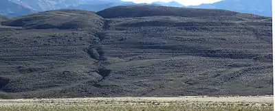 A long period of uplift and erosion was concurrent with and followed the above events, creating a major unconformity.[13] Sediments worn off the Death Valley region were shed both east and west and carried by wind and water; the eastern sediments ended up in Colorado and are now famous for their dinosaur fossils.[14] No Jurassic to Eocene sedimentary formations exist in the area except for some possibly Jurassic-age volcanic rock around Butte Valley.[13] Large parts of previously deposited formations were removed; probably by streams that washed the sediment into the Cretaceous Seaway that longitudinally divided North America to the east.[13]