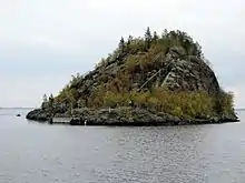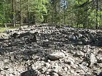 The southwestern part of Finland is mainly made up of rocks of the Svecofennian Domain or Svecofennian orogen.[10] These rocks are invariably of Proterozoic age. Its boundary with the Karelian Domain (of mixed Archean and Paleoproterozoic rocks) is a northwest-southeast diagonal.[10] Plutonic rocks that formed during accretion of volcanic arcs or continental collisions of the Svecofennian orogeny are common in Svecofennian Domain.[17][18] Among these rocks the largest grouping is the Central Finland granitoid complex covering up much of Central Finland, Southern Ostrobothnia and Pirkanmaa.[18] Granitoids that intruded in the aftermath of the Svercofennian orogeny are common in southern Finland occurring mostly within ca. 100 km of the Gulf of Finland or Lake Ladoga.[18][19] These so-called Lateorogenic granites are distinguished by usually containing garnet and cordierite and being accompanied by rather few rocks of mafic and intermediate composition.[19] Scattered small granitoids crop out within the same zone. Formed 1810–1770 million years ago, these are the youngest granitoids in southern Finland associated with the Svecofennian orogeny.[14]