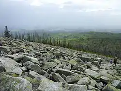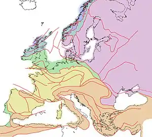 In northern Germany, almost the entire surface geology is made of Cenozoic sediments, mainly of Pleistocene and Holocene glacial or fluvioglacial deposits. Moraines and urstromtals determine the relief . Thus the Southern Ridge (German: Südliche Landrücken) is a moraine of the Saale glaciation and the Northern Ridge (German: Nördliche Landrücken) is a moraine of the Weichselian glaciation.[5] The material of these sediments was picked up by the ice sheet on its way from Scandinavia to Central Europe and was deposited during the melting there. The route that the ice took can be reconstructed with the aid of rocks, the cobbles in the moraine sediments, because these can be matched with certain regions in Scandinavia . In southern Germany, with the exception of the Alpine foreland and the Upper Rhine Graben, there are rather thin Quaternary deposits and formations, geographically confined mostly to lower slopes and valleys where they occur as scree and stone runs or as fluvial gravels and sands. In the foothills of the Alps, there are also Pleistocene moraines. There, however, the cobbles originate from the Alps and a different nomenclature than in Northern Germany is used for the glacial periods in which the ice from the mountains in the south pushed into the foothills: The Saale glaciation corresponds there to the Riss glaciation; the Weichselian glaciation corresponds to the Würm glaciation.
