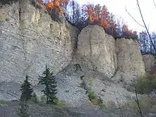 The Helvetic Domain (also known as the Helvetic Nappes) (German: Helvetikum) strikes approximately east-west in a strip, mostly only a few hundred metres wide, right at the northern edge of the Alps with siliciclastic and carbonate rocks of the Cretaceous and the early Tertiary that are overthrust towards the north onto the southern edge of the Molasse Basin. There are mainly shallow marine formations that are, for example, rich in nummulites (the Kressenberg Formation).[6][7] They represent the inner continental shelf on the southern edge of pre-Alpine Europe and they were not affected by the folding and overthrusting processes of the Alpine Orogeny until relatively late.