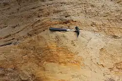 The Cenozoic platform (German: Känozoisches Deckgebirge) comprises Tertiary and Quaternary rocks. It is also known as the "unconsolidated rock" level (German: Lockergesteinsstockwerk) because, due to their young age, the Cenozoic sedimentary rocks have often not experienced intensive diagenesis and are therefore often not cemented. Because the youngest deposits in an uplifted area are removed first, the Cenozoic platform deposits occur extensively only in young Cenozoic subsidence areas in the Central European Blocks region where the largest outcrops are the Upper Rhine Graben, the Mainz Basin and the Molasse Basin (Alpine foreland trough). Special "subsidence areas" are the Nördlinger Ries and the Steinheim crater, both originating through a meteorite impact event.[3] The Cenozoic deposits in the Central European Blocks region consist of both siliciclastic rocks and limestones and both marine and continental sediments. The Cenozoic in Germany is also represented by volcanic rocks. In contrast to the mostly acidic (SiO2-rich) volcanic rocks of the transition level, the Cenozoic formations are mostly intermediate to very SiO2-poor (trachyte, basalt, phonolite, tephrite, nephelinite and basanite).[4] The largest Cenozoic volcanic areas in Germany are the Vogelsberg Mountains, the Westerwald, the Rhön Mountains and the Eifel.