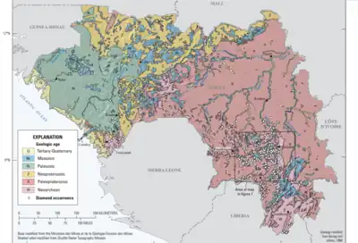 The geological formation of Guinean-Liberian belt is Precambrian and Paleozoic rocks.[2] Large bauxite laterite deposits in Silurian shale and Ordovician sandstone have been sourced in the Tertiary by the dolerites; these are discovered in the Fouta Djalan mountain.[3] In the northeastern part of the country, gold has been registered in Birimian. In the crystalline area of the north and south east of the country the prime mineral is iron ore which has itabirites.[4]