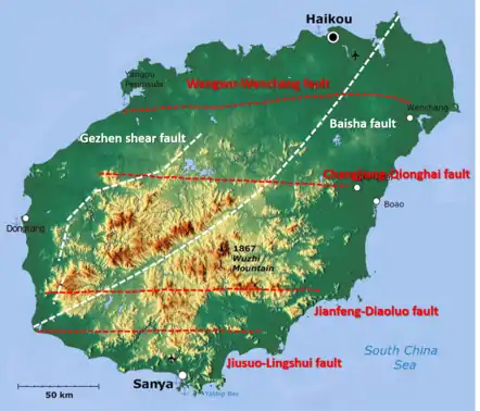 There are dominantly two sets of fault system existed in Hainan Island, one set was trending east and the other was trending northeast.[2] Wangwu-Wenchang fault, Changjiang-Qionghai fault, Jianfeng-Diaoluo fault and Jiusuo-Lingshui fault are the major east-trending faults, while Gezhen shear fault and Baisha fault are the dominant northeast-trending faults on the Island.[1]