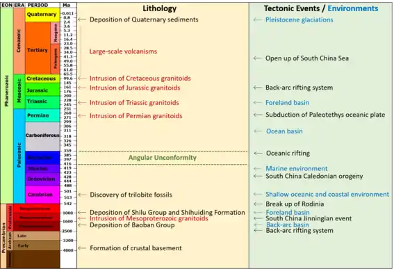 As in Cambrian, the Cathaysia Block and the Yangtze Block were drifted apart at the stage of Rodinia breakup.[12] During Middle Ordovician to Late Silurian, these two previously drifted apart blocks were collided with each other again, forming the large South China Block.[7] This event is referred as the South China Caledonian orogeny which probably took place in 430–400 Ma.[13] There exhibited an angular unconformity in high angles between the Silurian rocks and the Carboniferous rocks in which the Devonian units were missing.[10]