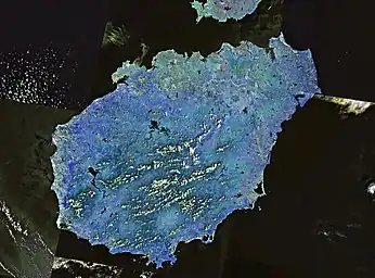 Hainan is mainly covered by igneous rocks emplaced from Permian through Cretaceous periods.[2] Structurally, there are two main sets of faults, one trending east and the other northeast.[2] The formation of the oldest fault, Gezhen shear fault, can even be dated back to the Precambrian times.[1]