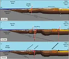 - The late subduction phase, when the opening of the Bransfield Rift and back-arc basins occur. This is followed by contemporaneous terrestrial and submarine volcanic activity, from the Oligocene-present day.[5]