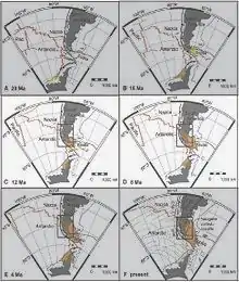 The Antarctic Peninsula, roughly 1,000 kilometres (650 mi) south of South America, is the northernmost portion of the continent of Antarctica. Like the associated Andes, the Antarctic Peninsula is an excellent example of ocean-continent collision resulting in subduction.[1] The peninsula has experienced continuous subduction for over 200 million years,[2] but changes in continental configurations during the amalgamation and breakup of continents have changed the orientation of the peninsula itself,[3] as well as the underlying volcanic rocks associated with the subduction zone.[4]