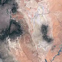 Nearly 10,000 feet (3,000 m) of sedimentary strata are found in the Capitol Reef area, representing nearly 200 million years of geologic history of the south-central part of the U.S. state of Utah. These rocks range in age from Permian (as old as 270 million years old) to Cretaceous (as young as 80 million years old.)[1] Rock layers in the area reveal ancient climates as varied as rivers and swamps (Chinle Formation), Sahara-like deserts (Navajo Sandstone), and shallow ocean (Mancos Shale).