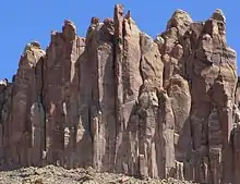In Mid Jurassic time gypsum, sand, and limey silt were deposited in what may have been a graben that was periodically covered by sea water and thus a place where repeated flooding was followed by evaporation.[13] The resulting Carmel Formation is composed of 200 to 1,000 feet (60 to 300 m) of reddish-brown siltstone, mudstone and sandstone that alternates with whitish-gray gypsum and fossil-rich limestone in a banded pattern. Fossils include marine bivalves and ammonites.[14] Most of the Carmel has been removed from the Waterpocket Fold's crest but outcrops can be seen capping the Golden Throne and atop various domes in the area. It can also be seen as reddish-brown triangular-shaped spurs called 'flatirons' that form the Waterpocket Fold's eastern rampart.