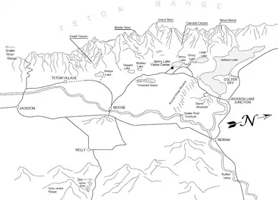 Sediment collected in various lakes in the area from around 17 to 15 million years ago, becoming the Miocene-aged Colter Formation.[13] Beginning around 13 million years ago (also in the Miocene), a 40-mile (64-km) long steeply east dipping normal fault system called the Teton Fault started to vertically move two adjacent blocks.[14] One block, the Jackson Hole basin, moved down while the other block, containing the westward-tilting eastern part of the Teton Range, moved up; thus creating the youngest mountain range in the Rocky Mountains.[14] Most of the downward movement occurred right next to the fault, resulting in a 15° tilt of the Colter Formation.[13] No sediment was deposited on top of the tilted Colter Formation for up to three million years, resulting in an angular unconformity as the tilted Colter partially eroded away.[15]