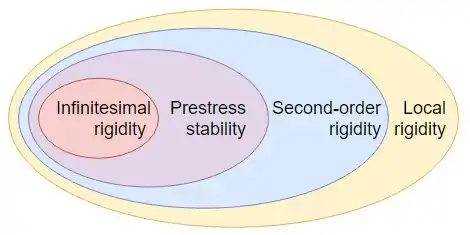 Prestress stability is weaker than infinitesimal and static rigidity but stronger than second-order rigidity. Consider the third sufficient condition for second-order rigidity. A -dimensional framework is prestress stable if there exists an equilibrium stress such that for all non-trivial velocities , . Prestress stability can be verified via semidefinite programming techniques.[4]