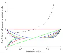 The rate of convergence also depends on the value of the common ratio r. Specifically, the rate of convergence gets slower as r approaches 1 or −1. For example, the geometric series with a = 1 is 1 + r + r2 + r3 + ... and converges to 1 / (1 - r) when |r| < 1. However, the number of terms needed to converge approaches infinity as r approaches 1 because a / (1 - r) approaches infinity and each term of the series is less than or equal to one. In contrast, as r approaches −1 the sum of the first several terms of the geometric series starts to converge to 1/2 but slightly flips up or down depending on whether the most recently added term has a power of r that is even or odd. That flipping behavior near r = −1 is illustrated in the adjacent image showing the first 11 terms of the geometric series with a = 1 and |r| < 1.