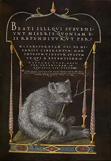 Between 1581 and 1590, he illustrated the Tridentine version of the Roman missal (now in the National Library in Vienna), a commission for Ferdinand II, Archduke of Austria.[8] He added illuminations throughout the missal, which consists of 658 vellum folios. His decorations include nature imagery and grotesque borders. The calendar pages are illuminated with small gaming-boards, instruments and animals linked by strapwork. The images carry emblematic content, typically related to the particular religious text it accompanies or to the patron.[1]