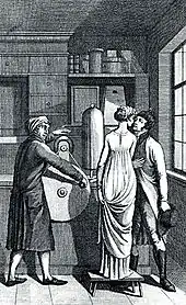Bose's "Electric Kiss" (also called "Electric Venus") demonstration was immensely popular with spectators, and it was little more than a variation on Stephen Gray's "Flying Boy" demonstration.[3] An attractive young lady was invited to stand on a block of insulating resin, and she was given a moderate static charge from a spinning globe. A young man from the audience was then invited to give her a kiss, and, in the process, the pair received a reasonable shock.[4]