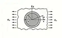 A major breakthroughs of his research was the elasticity solution he developed for the fiber-matrix-interface stress-distribution type problem.[5] The problem itself consists of an isolated fiber in an infinite medium (matrix). A third phase (interphase) is assumed between the fiber and the matrix (see figure 1). The matrix is uniformly loaded in tension. Both the fiber, interphase and matrix are considered to be linear elastic and isotropic. The interface between the three materials is also assumed to be perfectly bonded.