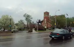 Because of public protests, the city moved the statue to a better location in August 1955. When movers arrived to take the statue to a new location, they originally could not find it within the overgrown vegetation.[7] The statue was moved to its current location on the southwest corner of Elm Avenue and North Monroe Street along the River Raisin.[8] This is one of the most prominent intersections in the city, and the statue is well-lit at night. The statue is now one of the most recognizable objects in Monroe.[7] The George Armstrong Custer Equestrian Monument is located across Elm Street from the St. Mary's Church Complex Historic District and adjacent to the East Elm-North Macomb Street Historic District.