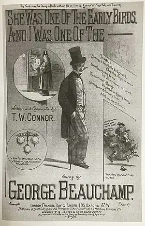 In the biography of Charles Morton, "The Father of the Music Halls", Beauchamp was described as "very eccentric but otherwise estimable..... [a] really droll comic-singer, who had the funniest of faces..".[4] His most successful songs included "Get Your Hair Cut" (written by Beauchamp with Charles Osborne and Fred Eplett, 1891), "She Was One of the Early Birds" (written by T. W. Connor, 1895), and "Has Anybody Seen Our Cat?" (also by Connor, 1899).[5] The song "She Was One of the Early Birds" was his biggest success, described in The Era in 1895 as "the rage of London".[3]