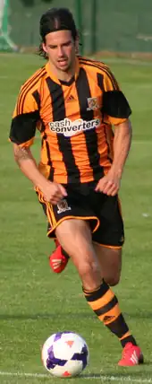 Boyd subsequently joined Championship club Hull City on loan until the end of the 2012–13 season on 21 February 2013, with a view to a permanent move.[91] He made his debut two days after signing, coming on as a second-half substitute for Robert Koren in a 4–1 away defeat to Bolton Wanderers.[92] Boyd's full debut came at home in the following match a week later, as he scored twice in a 5–2 victory over Birmingham City on 2 March 2013.[93] After the performance, Hull manager Steve Bruce stated – "It was a wonder show. His work-rate and intelligence – he looked the real deal. I've always been a big admirer, but I didn't know he was that good. If he can keep performing like that then we've got some player on our hands".[94] He played regularly for the remainder of the season, including in Hull's 2–2 home draw with Cardiff City on the last day of the season, the match that ultimately secured the club's promotion back to the Premier League.[95] During his loan spell, Boyd made thirteen appearances and scored four times.[77]