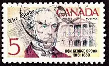 George Brown (November 29, 1818 – May 9, 1880) was a British-Canadian journalist, politician and one of the Fathers of Confederation; attended the Charlottetown (September 1864) and Quebec (October 1864) conferences.[1] A noted Reform politician, he is best known as the founder and editor of the Toronto Globe, Canada's most influential newspaper at the time, and his leadership in the founding of the Liberal Party in 1867. He was an articulate champion of the grievances and anger of Upper Canada (Ontario). He played a major role in securing national unity. His career in active politics faltered after 1865, but he remained a powerful spokesman for the Liberal Party. He promoted westward expansion and opposed the policies of Conservative Prime Minister John A. Macdonald.