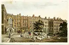 At first, Colebrooke was able to stay in business with assistance from the Bank of England, but his bank temporarily stopped payment on 31 March 1773, and permanently (after three years in the control of trustees appointed by his creditors) on 7 August 1776. Most of his property, including his share in the rotten borough at Gatton and art collection, was sold in 1774 to meet his liabilities, and a commission of bankruptcy was taken out against him in 1777.[12] Yet at the same period he was spending considerable sums on the rebuilding of his London house at 32 Soho Square.[13] The mansion was sold to Sir Joseph Banks in 1779.[13]