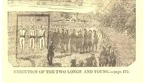 The suspects were traced to a loosely organized Middle West ruffian gang, operating out of northern Illinois, known as the "Banditti of the Prairie". Detective and bounty hunter Edward Bonney volunteered to infiltrate the gang and was able to arrest eight men, including Robert H. Birch. Although one man escaped and another disappeared, the others stood trial and were convicted of murder. Two received prison sentences [8] while another three, Granville Young and brothers John and Aaron Long, were later arrested and executed for the crime.[9] In October 1845, shortly before their execution, Young and the Long brothers were photographed by daguerreotypists Thomas Martin Easterly and Frederick F. Webb.[10]
