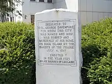 Colonel George Davenport, born George William King (1783 โ July 4, 1845), was a 19th-century English-American sailor, frontiersman, fur trader, merchant, postmaster, US Army soldier, Indian agent, and city planner. A prominent and well-known settler in the Iowa Territory, he was one of the earliest settlers in Rock Island. He spent much of his life involved in the early settlement of the Mississippi Valley and the "Quad Cities". The present-day city of Davenport, Iowa, is named after him.[1]