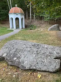 Dorr purchased a small spring at Sieur de Monts in 1909 and carved the words SWEET WATERS OF ACADIA into a nearby rock.[5] Atop the spring, Maine architect Frederick Lincoln Savage designed an octagonal canopy structure in the Italian Renaissance Revival style.[5]