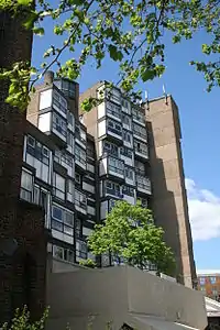 Finch's design for these heavily articulated towers remain exemplars when many tower blocks of the period have since been demolished. Finch described the irregular grouping of craggy blocks as "dancing around."[5] The scheme encompassed two-storey terraced houses with gardens and single occupancy dwellings for the elderly with maisonettes above, either side of a planted space. There was also a rehabilitation centre for the disabled, a community centre, a doctor's surgery and a launderette. Five towers of a similar or the same design can be found within walking distance of Stockwell Tube station, the closest a group of three to the South West of the station, all of which have since been painted white/cream. A further white/cream tower is located to the North West on Larkhall Lane, while a final tower in its original finish is located to the North East of the station on South Island Place.