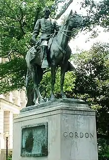 On June 6, Mayor Bottoms announced that the curfew for that night was called off due to there being no arrests the previous day.[54][56] Earlier that morning, 10 people[57] peacefully protested outside of Bottoms' home for about 30 minutes before leaving.[58] Despite the lifted curfew, the crowds of protesters was notably smaller than in the previous days.[29] Among the day's activities included a march from the King Center to Piedmont Park.[56] Later that night, about 100 people protested outside of the capitol for the removal of the equestrian statue of John Brown Gordon that stood on the capitol grounds.[55] Gordon was a previous governor of Georgia who had also served as a Confederate general in the American Civil War and is generally recognized as a leader in the Ku Klux Klan.[55] The Atlanta Journal-Constitution called the statue "one of the most controversial monuments to the Old South on the Capitol grounds."[59] Around 100 people protested at the capitol until about 11 p.m., by which point the crowds had dispersed.[60] Over the next several days, the statue became one of "the focus of protests", per the Georgia Recorder.[61] Several days later, 44 descendants of Gordon sent a letter to Governor Kemp urging him to remove the statue.[62][63]