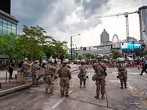 ![]() Georgia National Guard troops and protesters near Centennial Olympic Park, June 4 | |