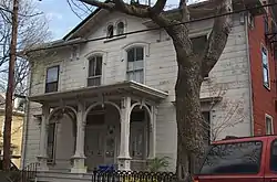 The George Gale House is a historic double house in Cambridge, Massachusetts. The three story frame house was built in 1858 by father and son, George T. Gale and George ?. Gale. They owned a lumberyard together in Kendall Square. The building at 14-16 Clinton Street is unusual as a double house in the Italianate style. It has typical Italianate features, including a central gable on the front facade, an elaborately decorated front porch and deep eaves with brackets all around. It is distinctively sheathed in flushboarding, giving the appearance of stone.[2]