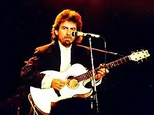 The discography of English singer-songwriter and former member of the Beatles, George Harrison consists of 12 studio albums, two live albums, four compilation albums, 35 singles, two video albums and four box sets (one of which is with Indian classical musician Ravi Shankar). Harrison's first solo releases – the Wonderwall Music film soundtrack (1968) and Electronic Sound (1969) – were almost entirely instrumental works, issued during the last two years of the Beatles' career. Following the band's break-up in April 1970, Harrison continued to produce recordings by his fellow Apple Records acts, notably former bandmate Ringo Starr.[1] He recorded and collaborated with a wide range of artists, including Shankar, Bob Dylan, Eric Clapton and Gary Wright.[2]