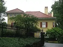 The son of George Hoadly, the Governor of Ohio in the 1880s, George Hoadley Jr. was a prominent Cincinnati lawyer and one of the partners in the law firm of Harmon, Colston, Goldsmith, and Hoadley. At the end of the 1890s, Hoadley commissioned the design of his new house from one of the area's more prominent architectural firms: Elzner and Anderson, which had already produced such structures as the Ingalls Building downtown. Leading proponents of construction with concrete, Elzner and Anderson designed many buildings with the material, but the Hoadley House is one of just two concrete houses that displays the material on its exterior; it is covered with a fake stucco made from concrete. Aside from the exterior, it is much more of a typical area house, being a three-story building with a frame structure,[2] a stone foundation, minor elements of wood, and a roof of ceramic tiles.[3]