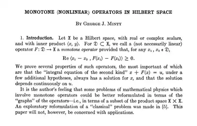 - Minty, George J. (1962). "Monotone (nonlinear) operators in Hilbert space". Duke Math. J. 29 (3): 341–346. doi:10.1215/S0012-7094-62-02933-2.