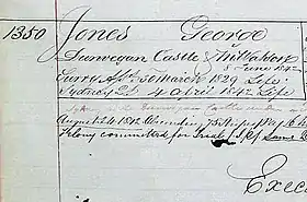 On 20 March 1829, Jones, aged about fourteen years, was tried at the Surrey Assizes for robbing a till and sentenced to transportation for life.[3][2] Jones was transported to New South Wales aboard the Dunvegan Castle with 179 other convicts, arriving in Sydney on 13 March 1830. On arrival he was assigned to Richard Lang on the Hunter River in the Newcastle district.[2]