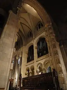 In 1888, a design competition for the Cathedral of St. John the Divine, the most prominent project of its kind in the US, was entered by 68 architectural firms, and won in 1891 by Heins & LaFarge, with an eclectic design, based on Romanesque forms but with many Byzantine and Gothic elements, dominated by a massive spired tower over the crossing. The cornerstone was laid December 27, 1892, but unexpectedly, massive excavation was required before bedrock was hit. Heins & LaFarge completed the east end and the crossing, temporarily roofed by Rafael Guastavino with a tiled dome (still standing). The Chapel of St. Columba was consecrated in 1911, but the death of Heins ended the contract with Heins & LaFarge. Some of the Cathedral trustees did not care for the original Romanesque-Byzantine design, preferring something more purely Gothic, and consequently they removed the project from LaFarge, the surviving architect of the team.[2] They hired a new architect Ralph Adams Cram, whose nave and west front would be continued in French Gothic style.