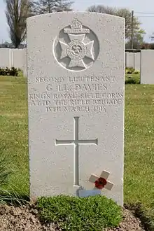 Following the UK's entry into World War I, Davies and his brother Peter volunteered for service. He received a commission as a second lieutenant in the King's Royal Rifle Corps and served in the trenches in Flanders[2] On the morning of 15 March 1915, Davies attended an early morning briefing with the battalion's colonel, where the officers were receiving instructions for an advance on the German position at St. Eloi (Ypres). Resting on a bank, Davies had not realised he was sitting in an exposed position. He died of a gunshot wound to the head, aged 21, killed by a German sniper.[3] This occurred six days after the death of his uncle, Colonel Guy du Maurier. J. M. Barrie wrote to George to inform him of his uncle's death, but by the time Barrie received his reply, George himself had been killed.[4]