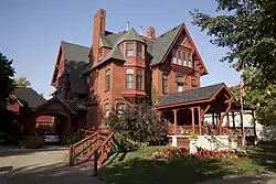 The Late Victorian style home was built for industrialist George M. Curtis in 1883. It was purchased by the Clinton Woman's Club in 1925 and they continue to maintain the building.[2] The three-story home is composed of brick veneer and features a variety of roof planes and windows. The original lacy wood porch was replaced by the current semi-circular porch in the 1940s. The main floor highlights various types of lumber throughout each room and it is reported that Mr. Curtis used his home as a sort of portfolio for his lumber business.