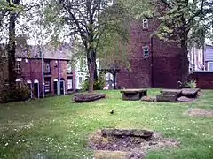 A warrant was issued for Marsh's arrest for heresy by Edward Stanley, 3rd Earl of Derby. Justice Barton of Smithills Hall in Bolton sent servants to arrest him at his mother's house, but Marsh gave himself up at the hall. After being "examined" at Smithills, according to local tradition, Marsh stamped his foot so hard to re-affirm his faith that a footprint was left in the stone floor.[3] While being questioned at Lathom House by the Earl of Derby it was thought that he could be made to conform and he was held in reasonable comfort. Marsh, however resisted the efforts to make him submit and when he refused recant was taken to Lancaster Gaol where he was brought for trial at the Quarter Sessions. For nearly a year, Marsh remained in Lancaster Gaol where he read from the Bible and prayed with townsfolk gathered outside his window until George Cotes, the Catholic Bishop of Chester intervened. Sympathisers offered support and priests tried to convert him. When statutes against heresy were enacted by parliament Marsh was taken to the gaol at Northgate, Chester.[1][4] He stood trial under Bishop Cotes in the Lady Chapel of Chester Cathedral.[5] Marsh refused to convert to Roman Catholicism, despite being given one last chance to recant while being tied to the stake at which he was about to be burned.[6] His imprisonment is documented in Foxe's Actes and Monuments.[7] Marsh's follower and brother-in-law Geoffrey Hurst, a Shakerley nail maker, was also imprisoned at Lancaster but was saved from execution by Queen Mary's death.[1]