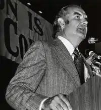By 1952, McGovern was coming to think of himself as a Democrat.[83] He was captivated by a radio broadcast of Governor Adlai Stevenson's speech accepting the presidential nomination at the 1952 Democratic National Convention.[84] He immediately dedicated himself to Stevenson's campaign, publishing seven articles in the Mitchell Daily Republic newspaper outlining the historical issues that separated the Democratic Party from the Republicans.[84] The McGoverns named their only son, Steven, born immediately after the convention, after his new hero.[70][85][nb 6] Although Stevenson lost the election, McGovern remained active in politics, believing that "the engine of progress in our time in America is the Democratic Party."[75] In early 1953,[85] McGovern left a tenure-track position at the university[74] to become executive secretary of the South Dakota Democratic Party,[87] the state chair having recruited him after reading his articles.[84] Democrats in the state were at a low, holding no statewide offices and only 2 of the 110 seats in the state legislature.[87] Friends and political figures had counseled McGovern against making the move, but despite his mild, unassuming manner, McGovern had an ambitious nature and was intent upon starting a political career of his own.[88][nb 7]