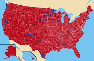 In the election, the McGovern/Shriver ticket suffered a 60.7 percent to 37.5 percent defeat to Nixon and Agnew.[58] At the time, it was the second biggest landslide in American history, with Electoral College totals of 520 to 17. McGovern's two electoral vote victories came in Massachusetts and Washington, D.C.; McGovern failed to win his home state of South Dakota, a state that had delivered for the Democrats in only three of the previous 18 presidential elections in the 20th century.[59] The 1972 election was the first in American history in which a Republican candidate carried every Southern state. Nixon's percentage of the popular vote was only slightly less than Lyndon Johnson's record in the 1964 election, and his margin of victory was slightly larger. Barry Goldwater, who was defeated by Johnson in 1964, sent McGovern a newspaper political cartoon depicting the two of them together "like Grandpa and Granny [patterned after the painting American Gothic] linked by our defeats", with a note scribbled "George – If you must lose, lose big."[27]