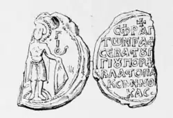George Palaiologos is attested to have been one of the attendants to the Council of Blachernae of March 1166.[17][18] He was also a patron of the arts. He dedicated a painting of the Archangel Michael in a church in Triaditza, showing himself and his son Alexios with the saint.[13] He also founded a monastery dedicated to the Theotokos, known for its lavish decorations: it included portraits of the emperors whose kinship he claimed, as well as a series of paintings celebrating Manuel I's military victories over the Hungarians.[19] Two of his seals of office survive.[2]