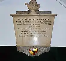Sacred to the memory of George Perry, merchant, of Liverpool, who died, universally respected, February 3, 1771, aged 52.[1]