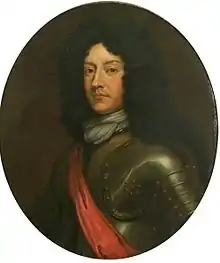 The war ended with the 1678 Treaties of Nijmegen but French expansion continued and Ramsay was promoted Major in early 1685.[14] In June, William sent the Brigade to help his father-in-law James II suppress simultaneous rebellions in Scotland and England but these quickly collapsed and it returned without seeing action.[15] When James demanded William repatriate the entire Brigade in early 1688, he refused, using the opportunity to remove officers of doubtful loyalty.[lower-alpha 2] [16] Among them was Ramsay's Colonel, John Wauchope, who became a senior Jacobite commander in the 1689-1691 Williamite War in Ireland.[17] As Lieutenant-Colonel, Ramsay commanded the regiment when it accompanied William to England in the November 1688 Glorious Revolution and was appointed Colonel in December.[14]